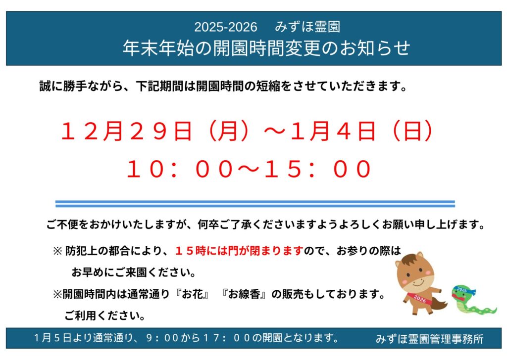 3. みずほ霊園 ~年末年始開園時間変更のお知らせ2025-2026~